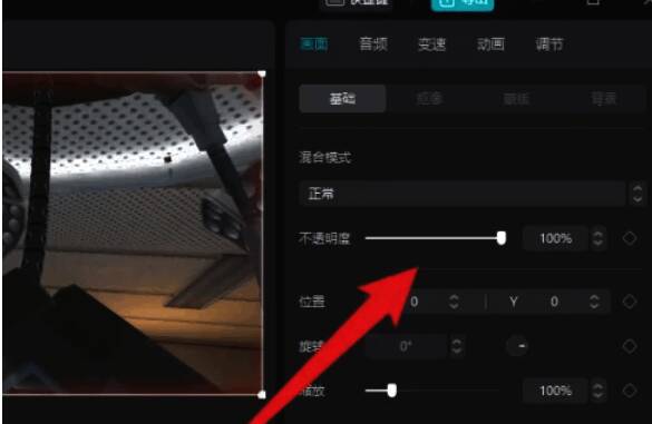 点击需要调整透明度的素材(轨道会高亮显示)。点击顶部菜单栏的 「画面」 选项卡(图标为矩形框内带小太阳)。或右键轨道上的素材,选择 「画面」 直接进入设置。在右侧「基础」分类下,找到 「不透明度」 滑块(默认值为100%,即完全不透明)。