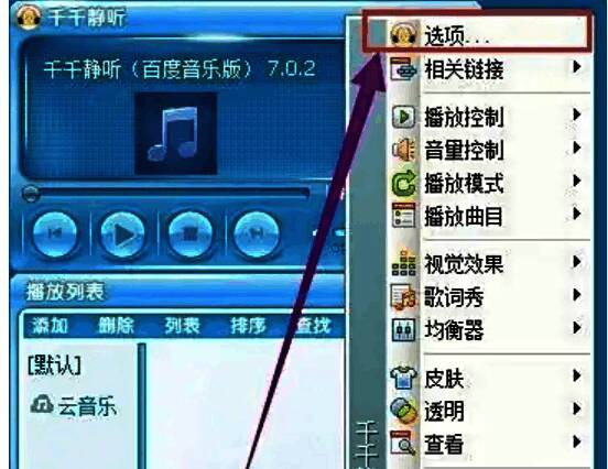 1、打开千千静听主界面,右键点击界面空白处,在弹出的选项中选择 “选项”。