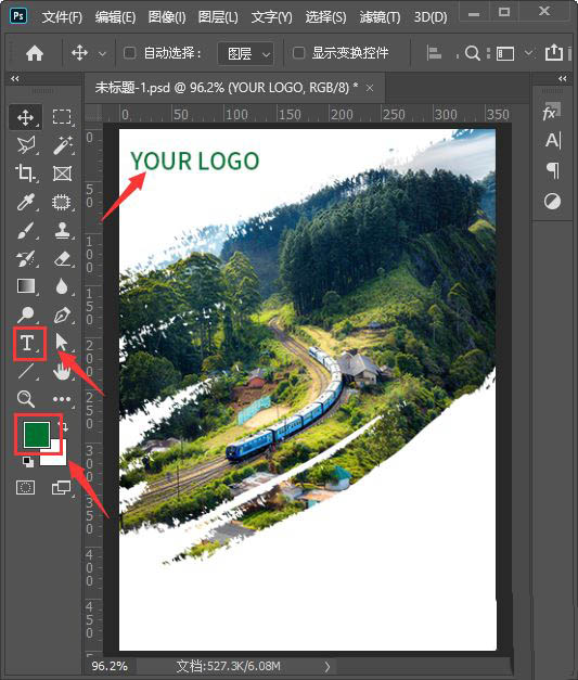 我们把前景色设置为绿色,然后用【文字工具】在画布的左上角处输入LOGO的文字(或插入LOGO图片),如图所示。