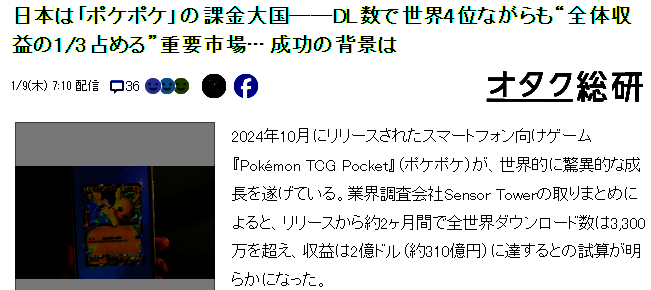 2024年10月,宝可梦公司推出了数字版的集换式卡牌游戏《宝可梦卡牌P》,迅速引发玩家追捧,据统计2月月收益就达到了2亿美元,其中日本玩家贡献收益四成,一起来看看日媒的分析什么让日本玩家热衷氪金。