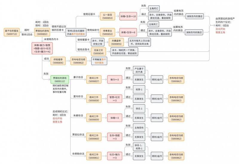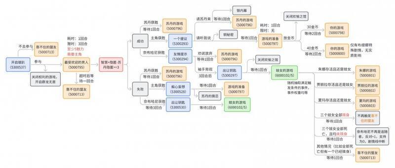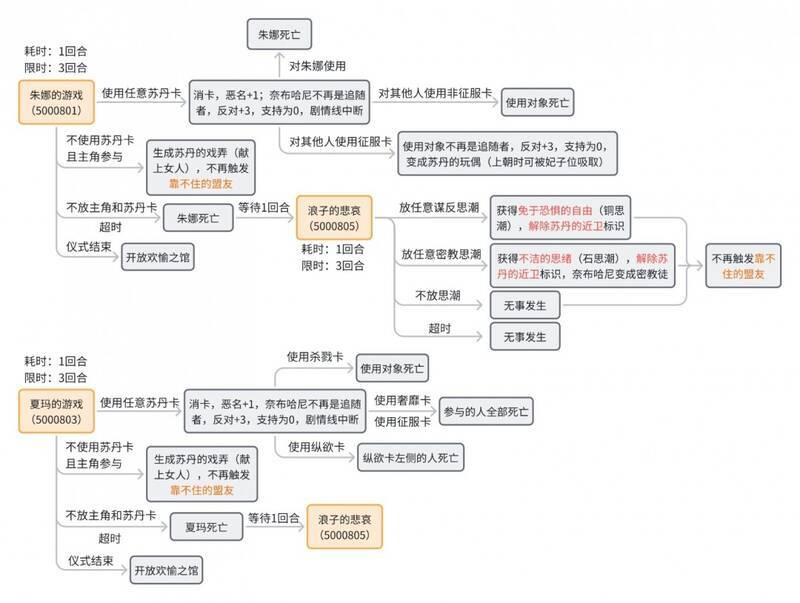 在这之后根据获胜者的不同,一共有三种游戏:苏丹的游戏,你的游戏,妓女的游戏。其中,妓女的游戏为随机抽取任意一个游戏,具体见流程图。