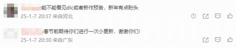 还有玩家期待DLC的公布,“你就给大伙透点DLC消息吧!”“能不能看见DLC或者新作预告,新年有点盼头”“冯总DLC建文件夹没?”“有没有DLC预告?”