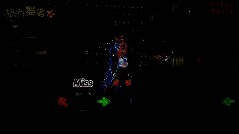 1、每个键的下落音符对应玩家的一个动作,若错过动作游戏将会暂停,并显示“MISS”。