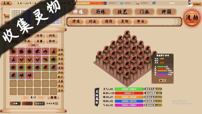 游戏中期,玩家可以创建自己的门派,招募不同天赋的弟子,收集开发资源,建造如洞府、经幡阁、武场等门派设施,组织弟子进行修炼和历练,以此提升门派的实力和威望,与其他门派进行交流、竞争或合作。