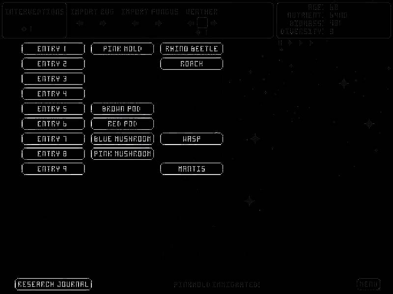 大地之声玩法简单,创建新世界后,可添加不同昆虫、菌类生物,让昆虫吞食菌类。还能自由控制时间流速,点击右上角按钮调节倍速,研究日志也会逐步解锁,助你了解生物信息。