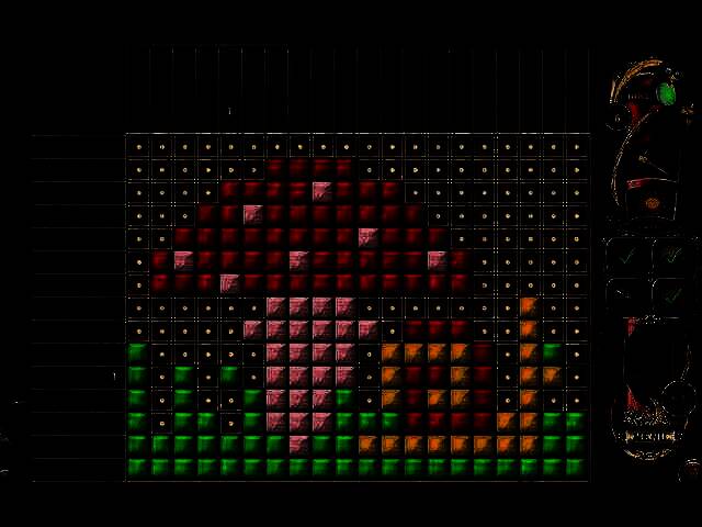 3、若某列上有5、4、2三个数字,该列从上至下需填充十一个方块,五个连续方块在上,空一格后填四个连续方块在中间,再空一格填两个连续方块在下方。