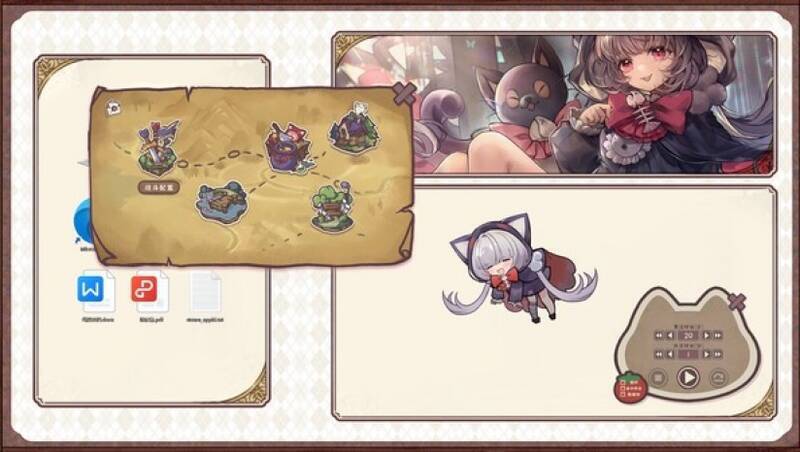 游戏采用日系萌系画风,角色设计融合猫耳元素与柔和的色彩搭配,动态效果细腻流畅,例如钓鱼时水波荡漾、战斗时的粒子特效等。场景设计以低饱和度的治愈系色调为主,搭配轻快的背景音乐与拟真音效(如翻书声、烹饪声),营造沉浸式氛围。通过Live2D技术实现角色面部表情与肢体动作的生动变化,支持4K分辨率适配,视觉表现力在同类桌宠游戏中处于领先水平。